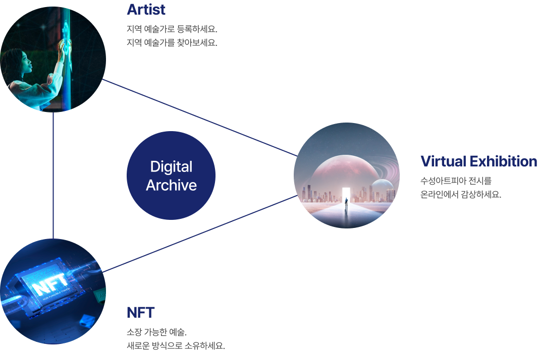 Ontpia는 수성아트피아의 전시를 언제 어디서나 만나볼 수 있는 디지털 플랫폼입니다. 온라인에 구현되는 전시를 통해 관람객들에게 새로운 방식의 예술 경험을 제공하고자 합니다.